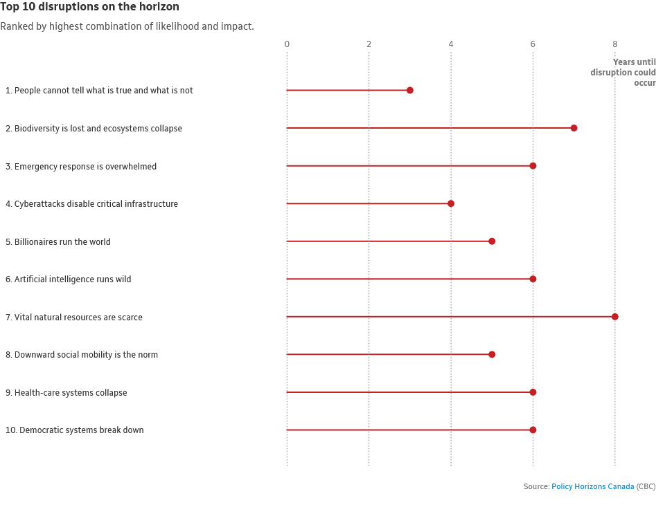 Leading the list of potential threats is the danger posed by disinformation and artificial intelligence (AI). In as little as three years, our "information ecosystem" could be overwhelmed by misinformation created by both humans and AI. This could lead to increased distrust and social fragmentation, isolating people into "separate realities" dictated by their media consumption. This scenario could severely compromise public decision-making and the effective communication of crucial information on education, public health, and government policies.